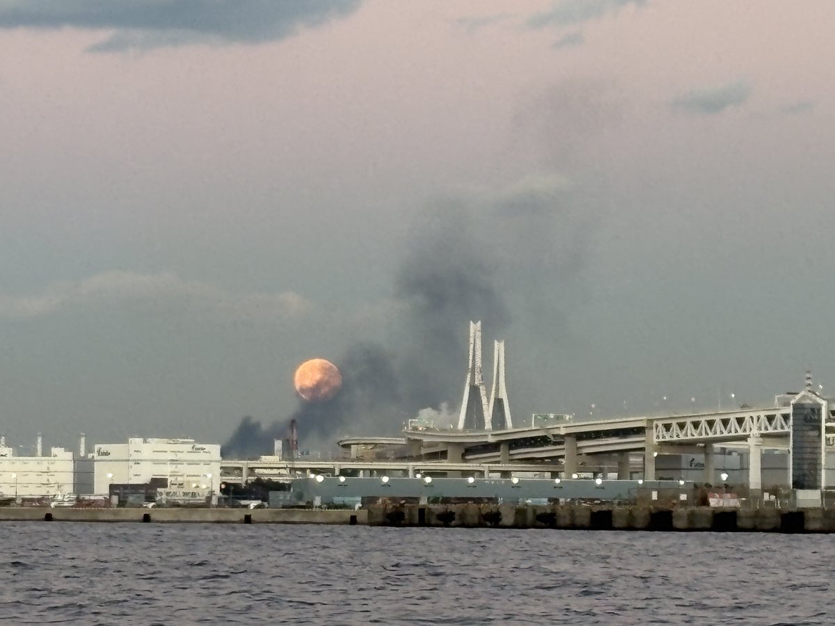 会社屋上から満月を撮ろうとしたら真っ黒い雲?煙が立ち昇ってました。