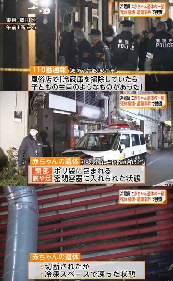 『警視庁は死体遺棄事件とみて捜査する。捜査関係者によると、現場は店の事務室などとして使われているといい、冷凍庫部分から発見されたという。現場はJR錦糸町駅近くの繁華街』