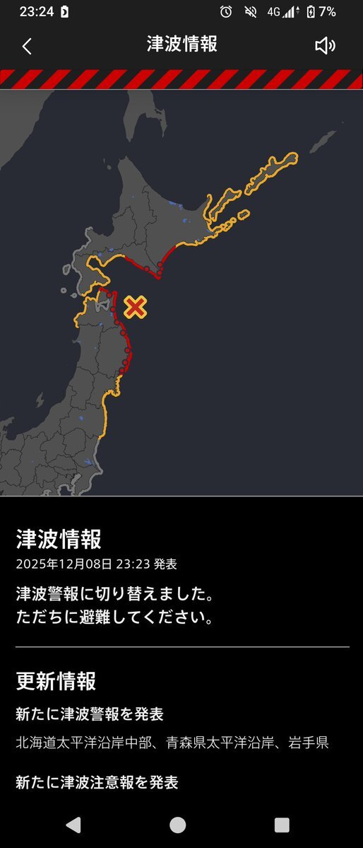 津波警報発令された🚨 pic.twitter.com/SSOv4SJNFl— 🍩Ad(あど)👑 (@KenjiS4412) December 8, 2025