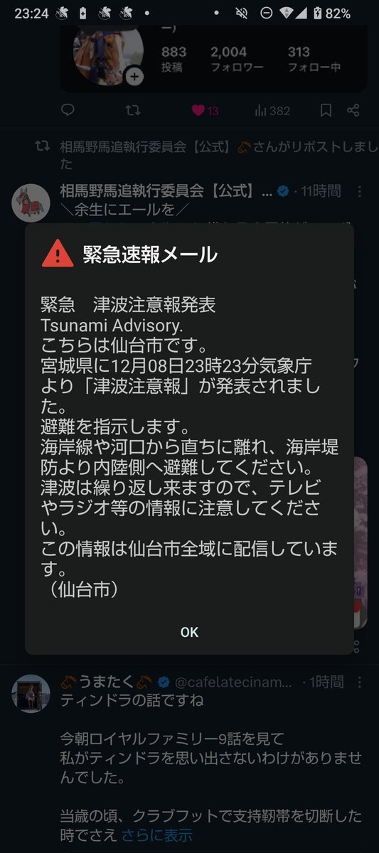 08日23時23分現在、津波警報発表中。津波は繰り返し襲ってきます。警報が解除されるまで安全な場所から離れないでください。最新の情報はこちらからご確認ください。https://t.co/Sw2dlt3oAe#いのちとくらしをまもる防災減災