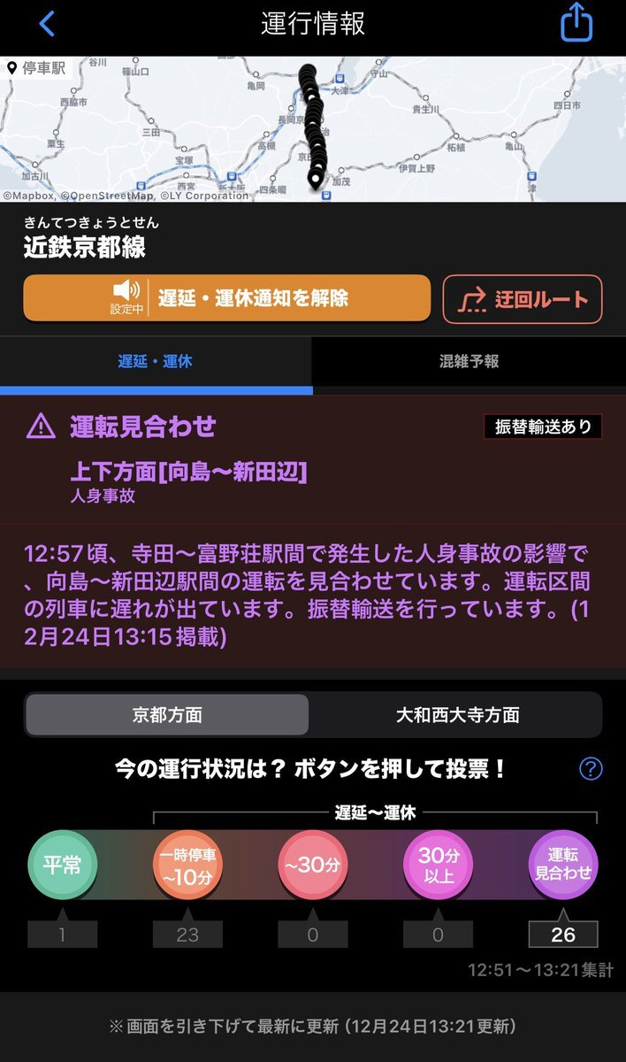 #運転見合わせ#近鉄京都線 は寺田〜富野荘間における人身事故の影響で向島〜新田辺間の運転を見合わせています。