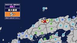 【地震】島根県東部を震源とする最大震度5弱の地震が発生 津波の心配なし
