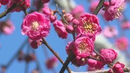 寺の境内にあり樹齢約300年…三重県紀北町で早咲きの『紅梅』が見頃を迎える 直径2cmほどの色鮮やかな花