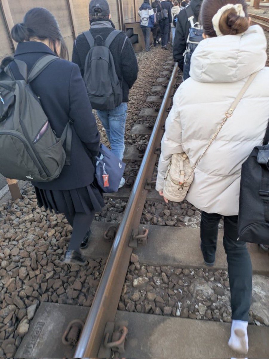 目の前の埼京線の線路上を、たくさんの人々が歩いている!!