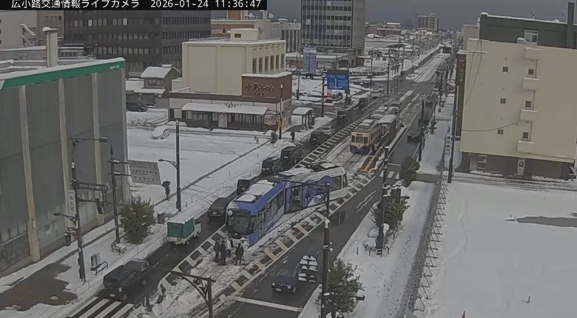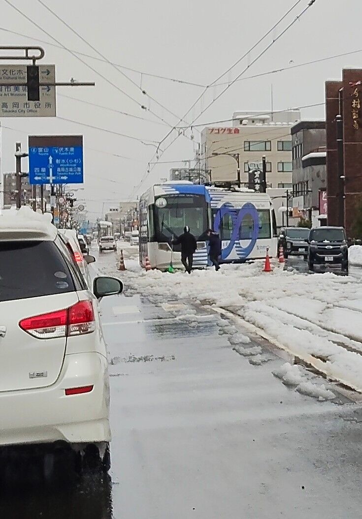 【現場の状況】#万葉線 富山県高岡市本丸町 広小路電停付近で回送車両が脱線事故により運転見合わせ遅延1月24日 #富山 #高岡 #大雪 #寒波
