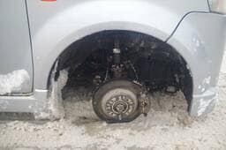 「ガタガタと音がして会社着いて確認しようと思ったら外れた」代車の軽自動車の右前輪からタイヤ脱落_対向車線へ転がったあと雪山に衝突_ケガ人なし<北海道札幌市>