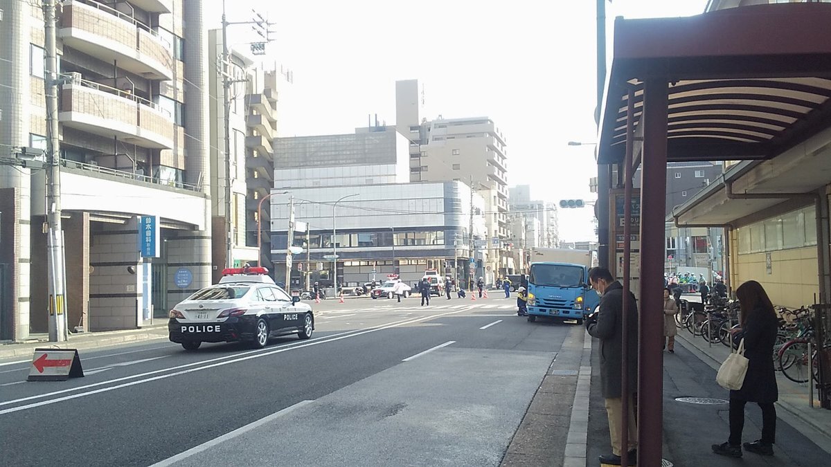 【現場の状況】#交通情報 堀川通り 京都府京都市中京区丸太町交差点付近 車両3台と歩行者からむ多重事故で通行止め渋滞2月5日 #京都 #堀川
