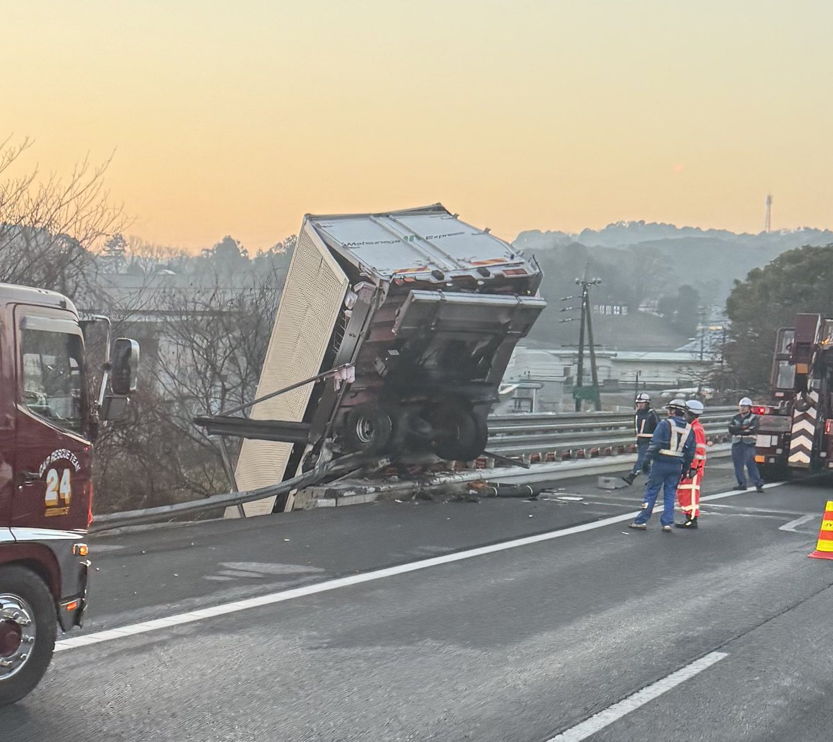 『豊田JCTの先エグい事故しとるやん。大型ガードレール突き破って飛び出しとる。