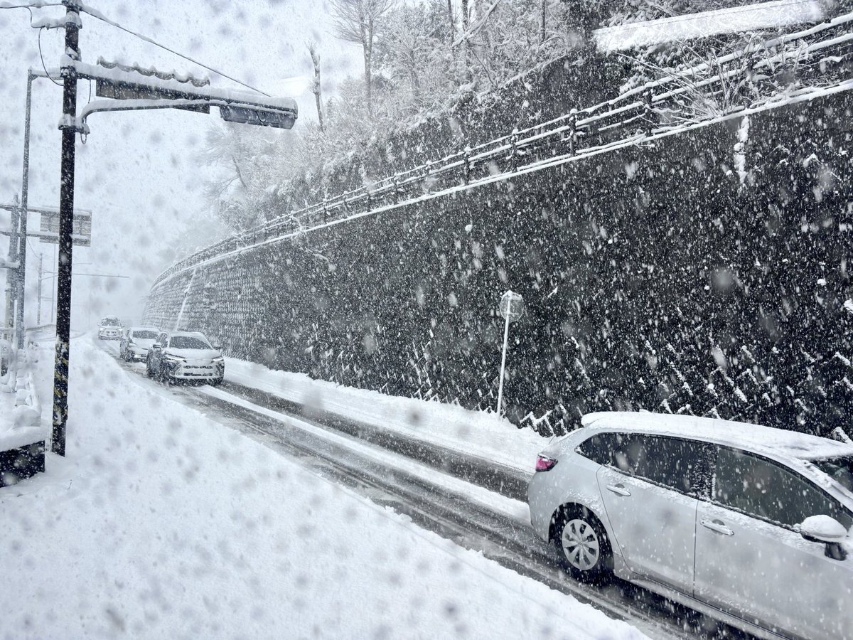 『ここ1時間くらいで急激に降ってきてるなー国道246の坂道で、何台も車がスタック🥶』