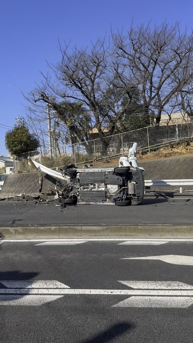 国道1号線戸塚警察署前の交差点で乗用車が信号機をなぎ倒してクラッシュして上り線通行止めにする事故。ピクリとも動かない原因はこれか・・・これだとドライバーは・・