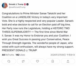 【速報】トランプ大統領「サナエ、あなたの連立政権を支持できたことは私の名誉」衆院選での自民圧勝に祝意 自身のSNSで