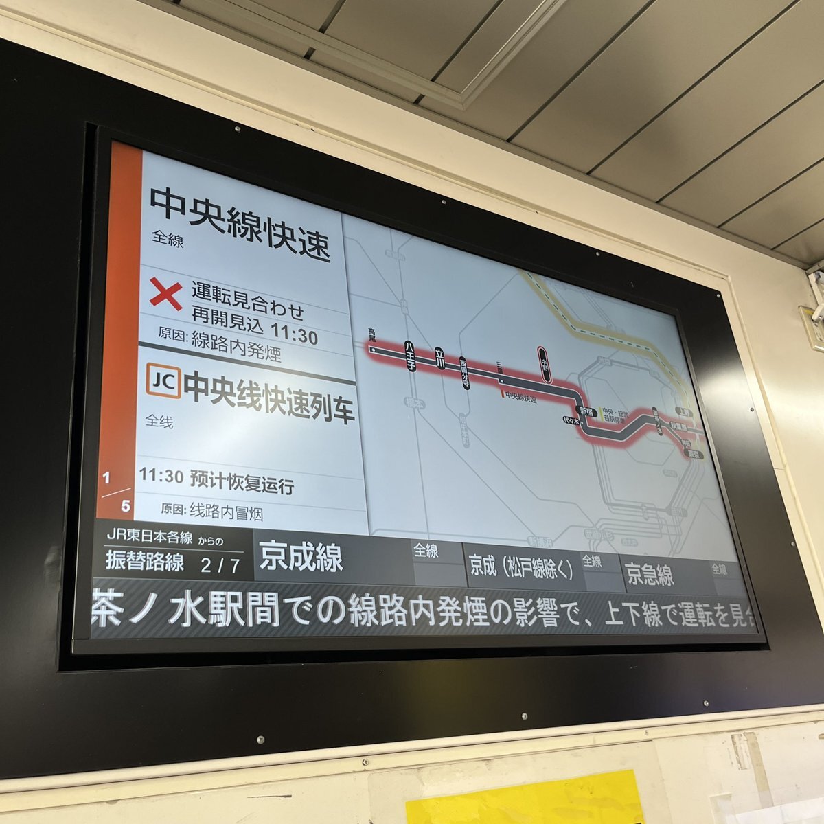 中央線快速電車は、四ツ谷〜御茶ノ水駅間での線路内発煙の影響で、上下線で運転を見合わせています。確認作業に時間を要しているため、運転再開見込は11時50分頃に変更になりました。 #中央線快速電車 #Chuo_Line https://t.co/Bw82N3lIYZ— JR東日本【中央方面】運行情報 (公式) (@JRE_F_Chuo) February 21, 2026