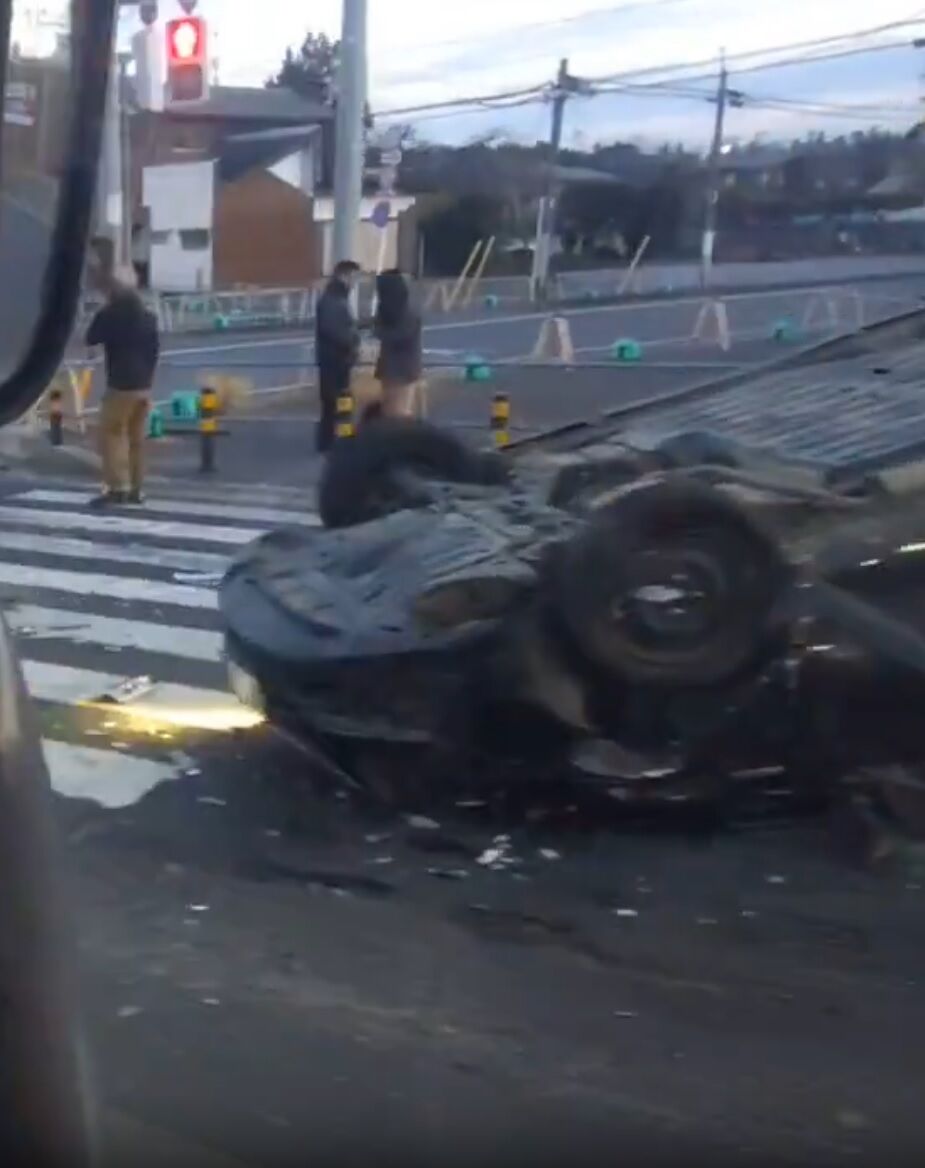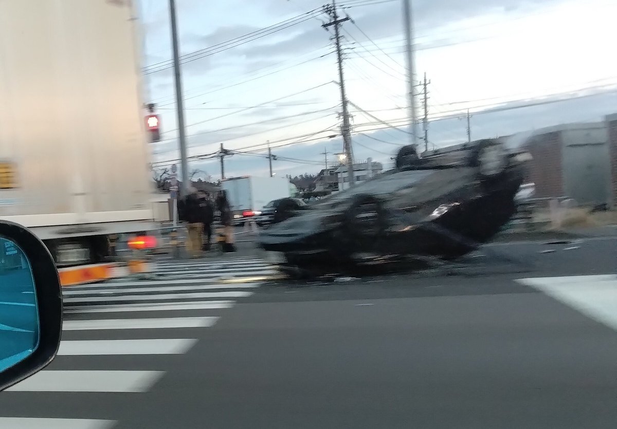 トラックと乗用車の横転事故が発生してます。