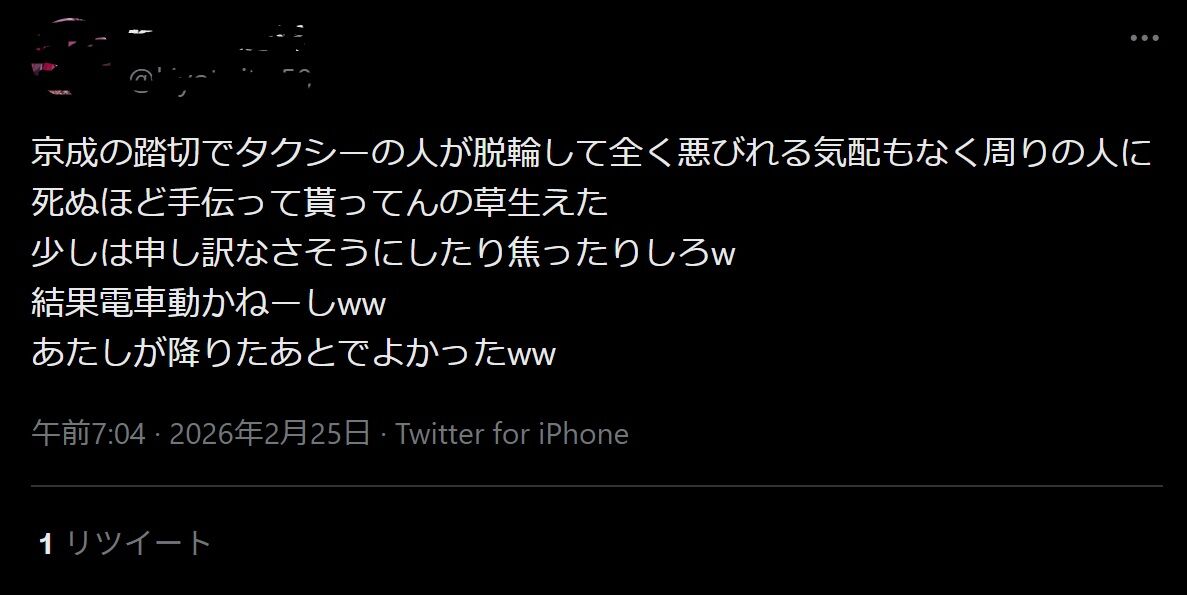 京成の踏切でタクシーの人が脱輪して全く悪びれる気配もなく周りの人に死ぬほど手伝って貰ってんの草生えた