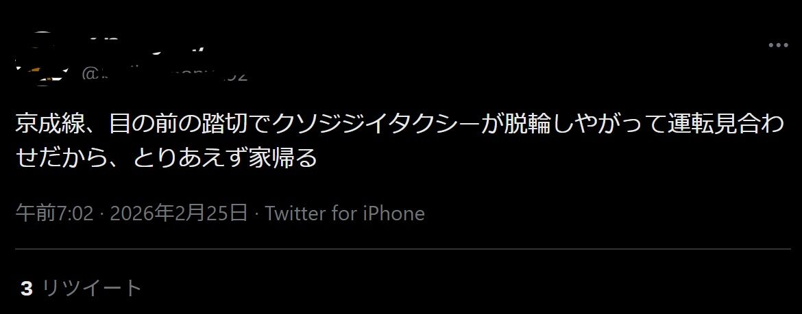 勝田台~志津駅間での乗用車脱輪…(02/25 07:43更新) #keisei https://t.co/8090QfdnFP— 京成電鉄運行情報【公式】 (@keiseirailway) February 24, 2026
