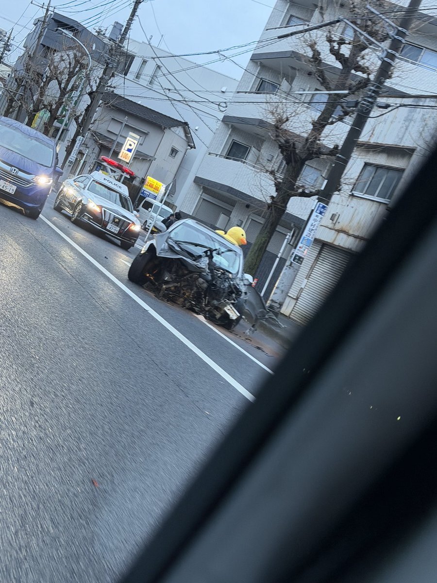 『尻手駅と陸橋の間左右にフロントの大破したビッグセダン(屋根にアヒル? )と