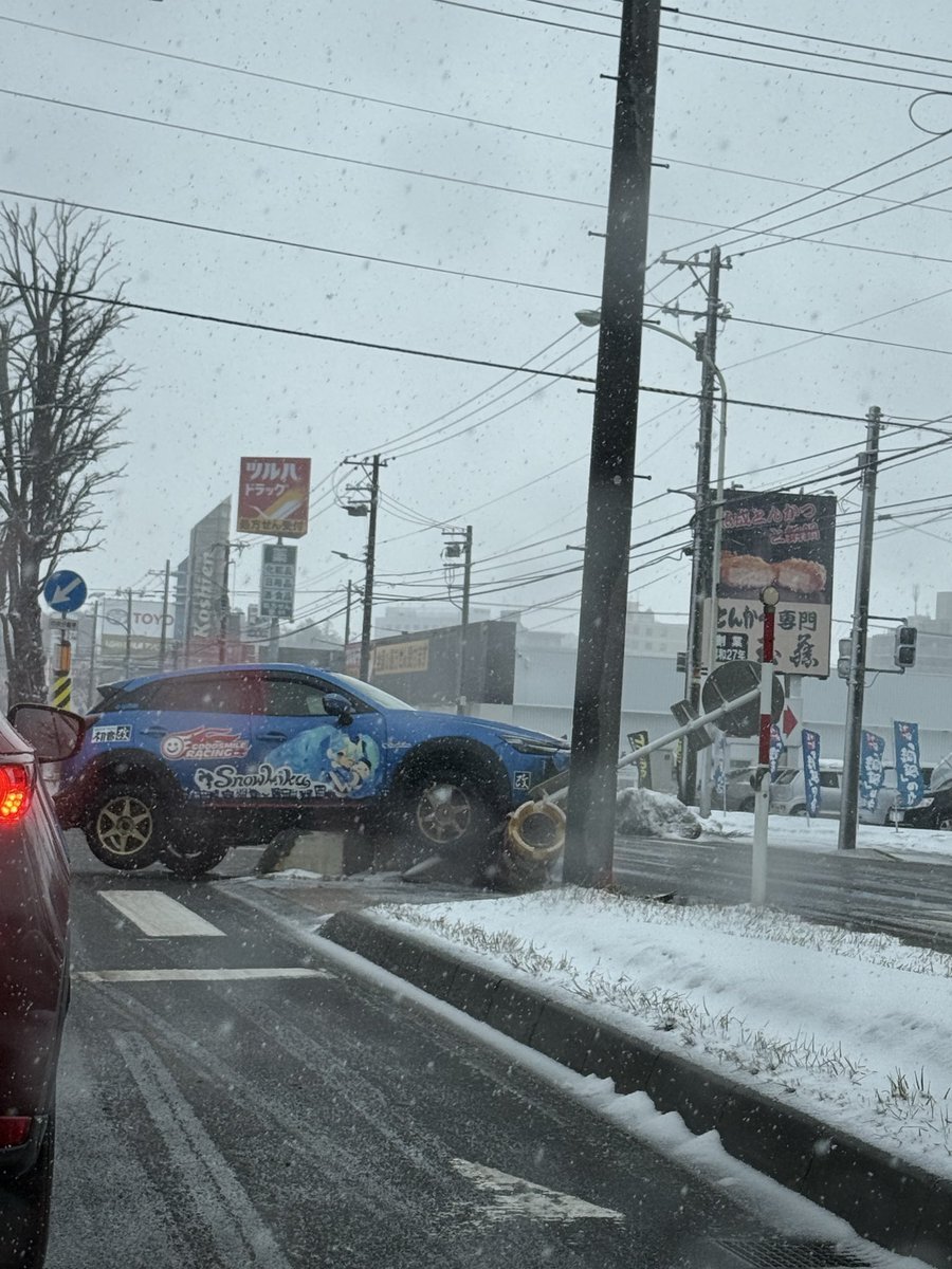 『南郷通りの中央分離帯に突っ込んで乗り上がってる痛車がおる』