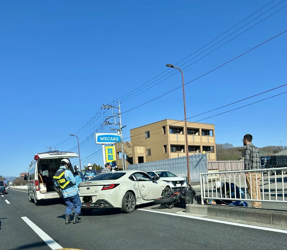 【現場の状況】#交通情報 新滝山街道 東京都八王子市梅坪町 道の駅八王子滝山西側付近 スポーツカーとバイク衝突事故で一部交通規制3月8日 #八王子 #バイク