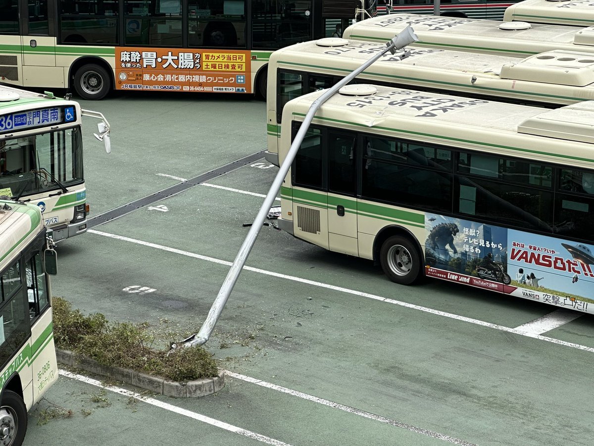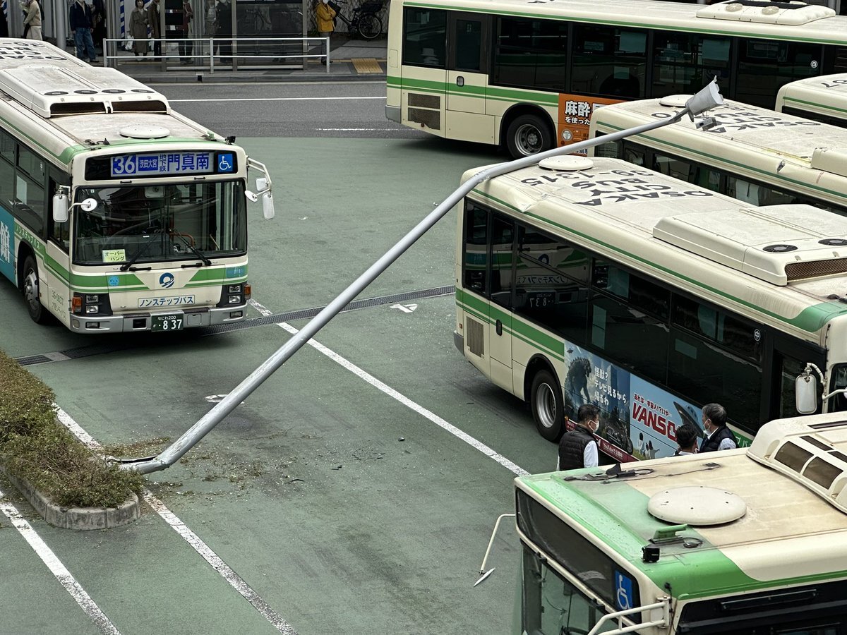『大丸前バスロータリー大きな音がしたので見たらバスに街灯が倒れてバスが凹んだ』