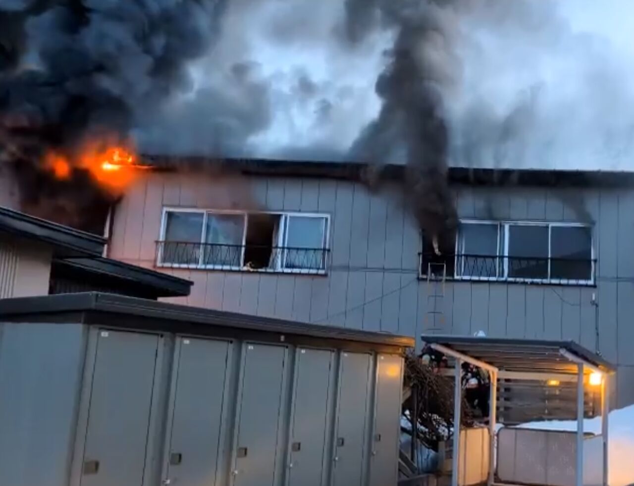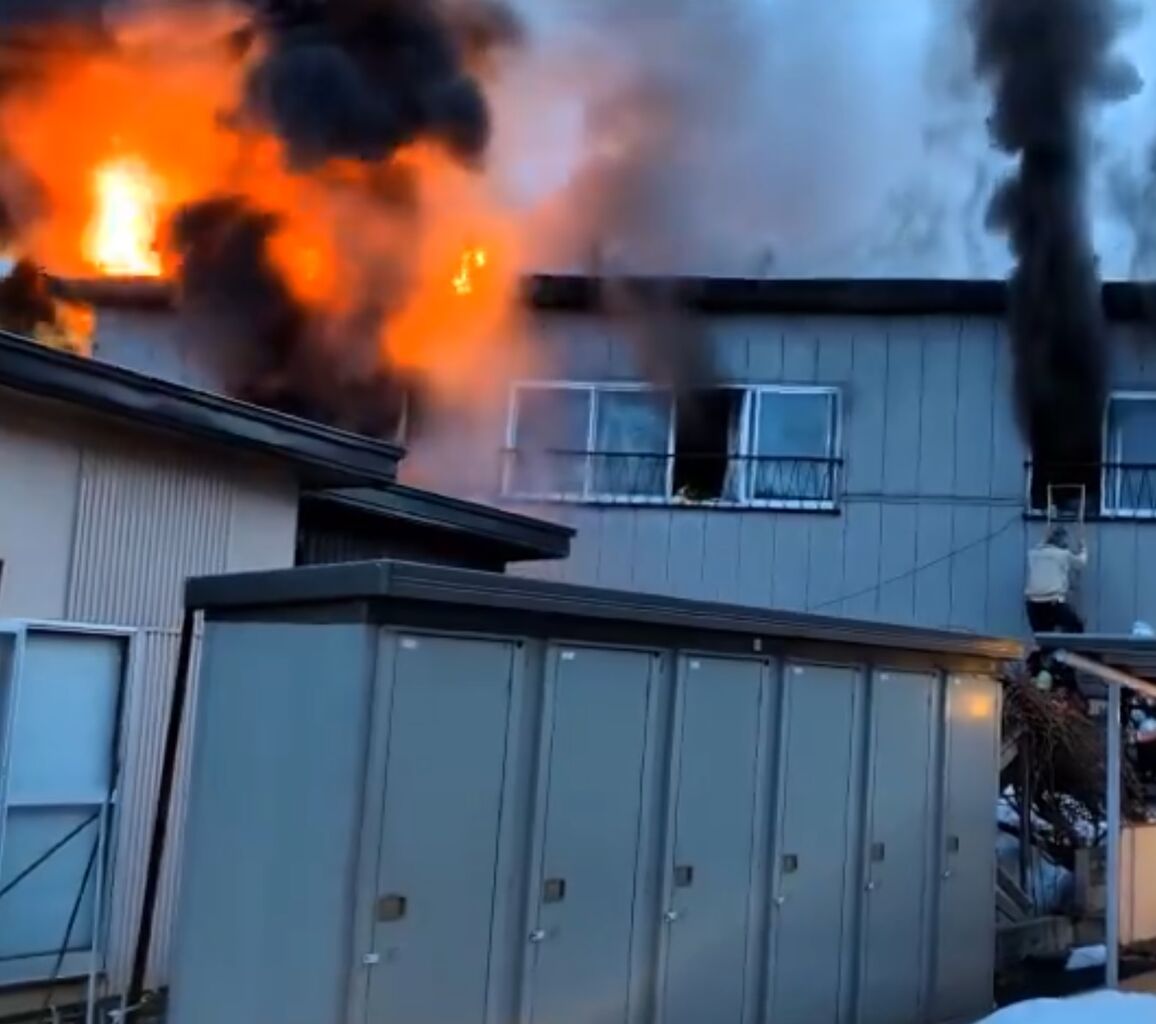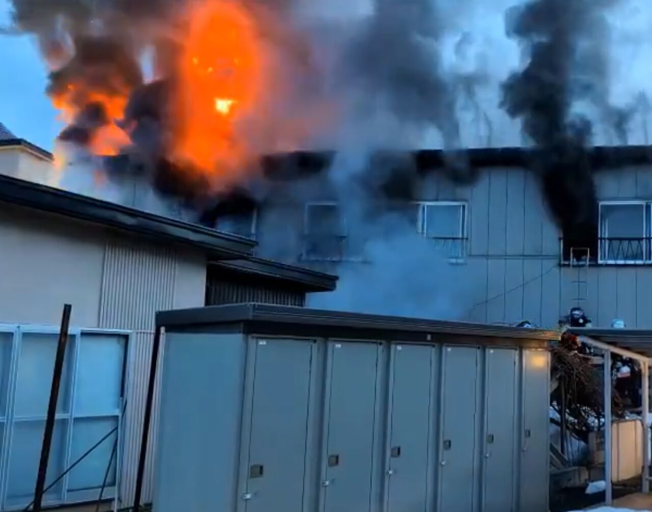 【火事情報】青森県青森市久須志2丁目付近 集合住宅建物から炎と黒煙あがる火災 周辺道路一時通行止め規制3月23日 #青森 #青森市 #火災