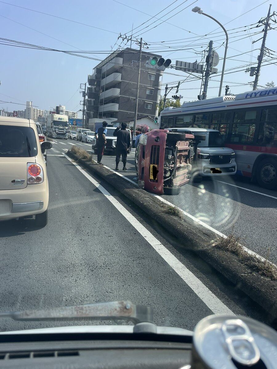 『江田駅の手前で車2台と路線バスの事故。1台は横転している』
