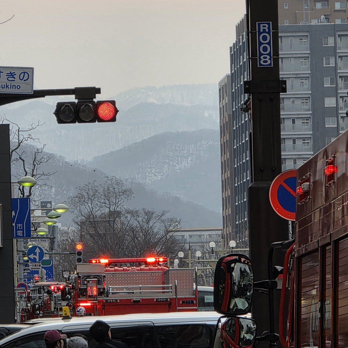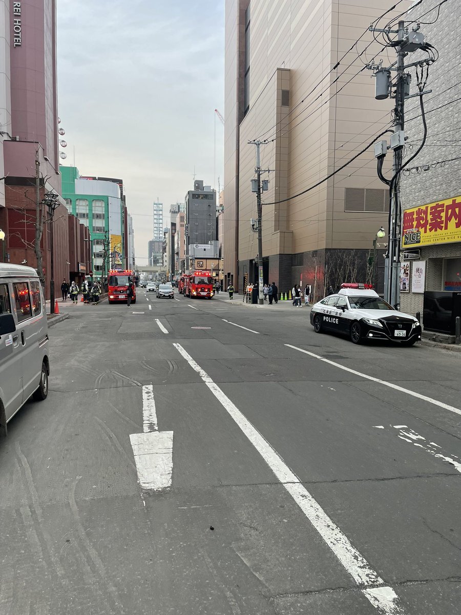 すすきの、ココノススキノに消防車集合してます。南4西4で火災出勤。火事臭い感じもなく消防車も消火活動待機という感じなので何事も無ければいいのですが。 pic.twitter.com/bXQ6zO16sF