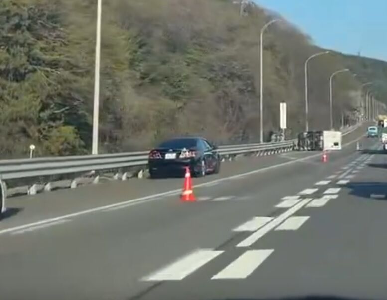 キャンピングカーらしき車の横転事故で、1車線規制中。』