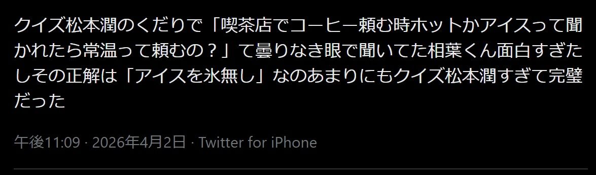 クイズ松本潤のくだりで「喫茶店でコーヒー頼む時ホットかアイスって聞かれたら常温って頼むの?」て曇りなき眼で聞いてた相葉くん面白すぎたしその正解は「アイスを氷無し」なのあまりにもクイズ松本潤すぎて完璧だった