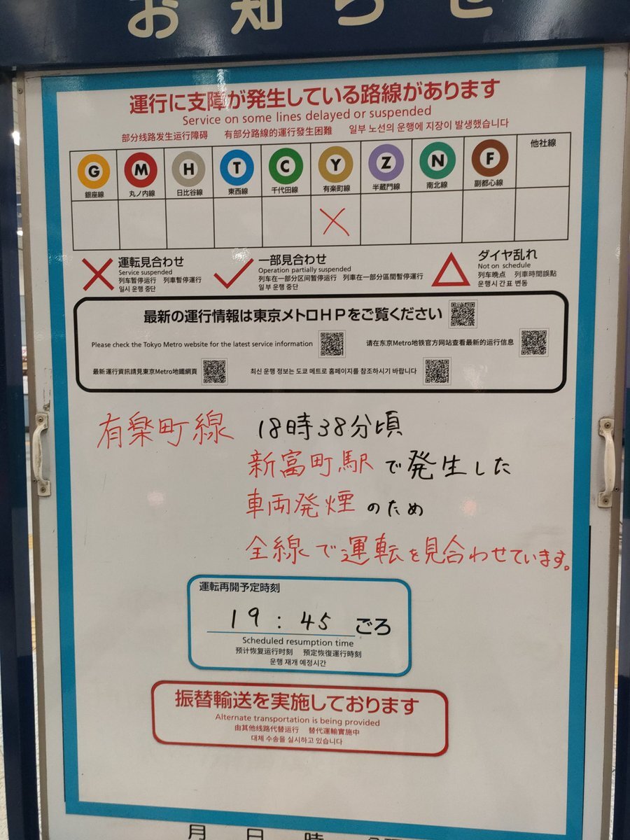 04月03日18時50分現在【運転見合わせ】18時38分頃、新富町駅で車両発煙のため、全線で運転を見合わせています。運転再開は19時45分頃を見込んでいます。只今、東京メトロ線、都営地下鉄線、JR線、東武線、小田急線、西武線、りんかい線、ゆりかもめ線、【続く】