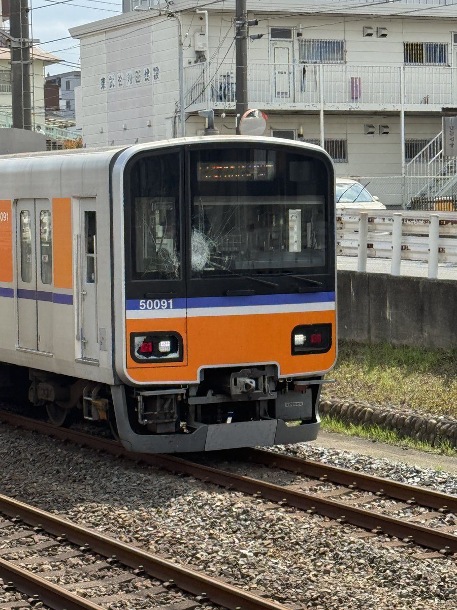 【現場の様子】『車両フロントガラス破損』#東武東上線 みずほ台駅で人身事故 #東京メトロ副都心線 #東急東横線 など遅延4月6日 #東上線 #富士見