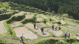 泥を塗りつけ水漏れ防ぐ…“日本の棚田100選”の丸山千枚田で畔塗り体験 田んぼのオーナーらが鍬を使って整える