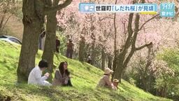 ピンクのカーテンの下でのんびり散歩 250本のしだれ桜見頃 広島・世羅町